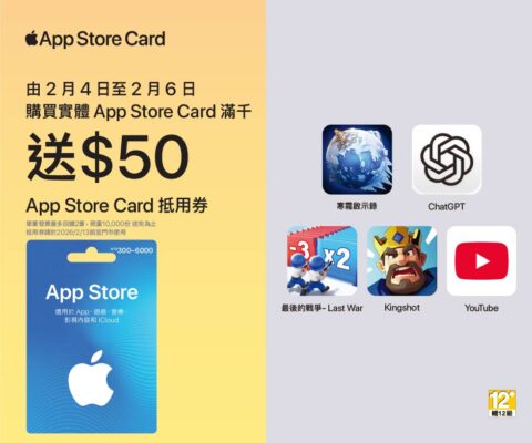 活動期間於7-ELEVEN購買實體 App Store Card 金額滿$1,000元,送 App Store Card 抵用券 $50元!(單筆發票最多回饋2份)。 ※活動期間:2026年02月04日至2026年02月06日。˙App Store Card 抵用券可使至2026/02/13。˙App Store Card 抵用券限量10,000份,送完為止。 ※注意事項1.虛擬點數卡不在此優惠活動範圍內。2.2026年02月04日00:00(GMT+8)起至2026年02月06日23:59(GMT+8)於全台開立統一超商發票門市購買實體 App Store… read more 限時3天 App Store Card 春節優惠